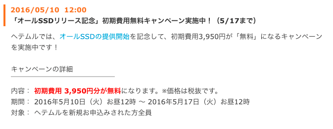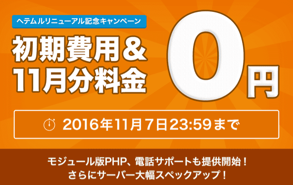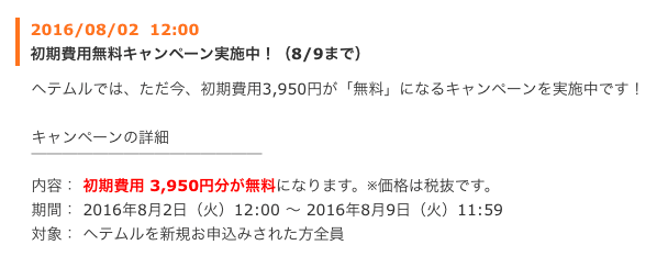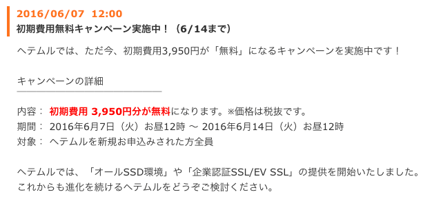 ヘテムルを新規お申込みされた方全員を対象に、初期費用(標準3,950円)が無料となるキャンペーンです。
