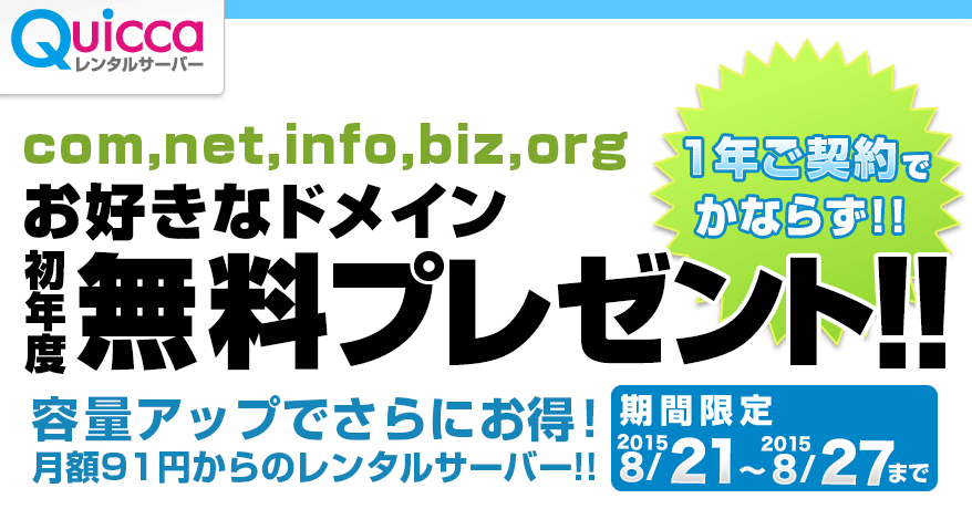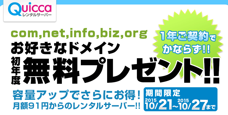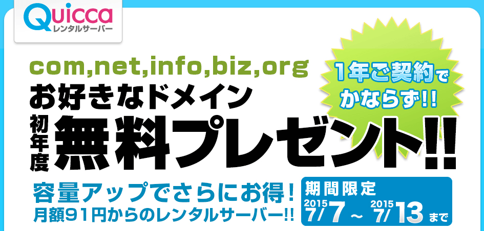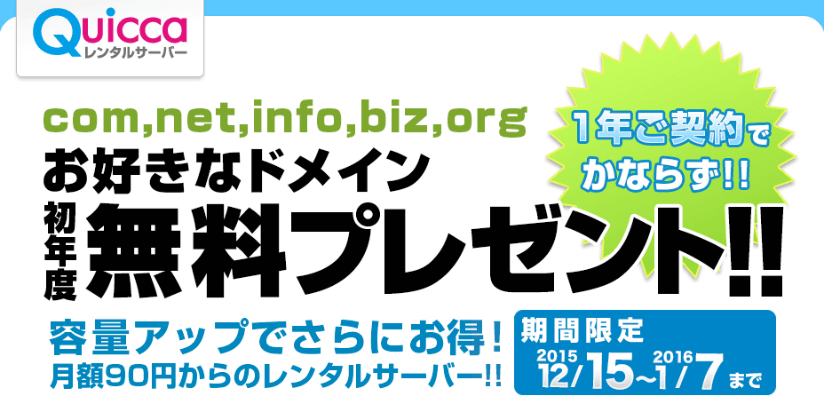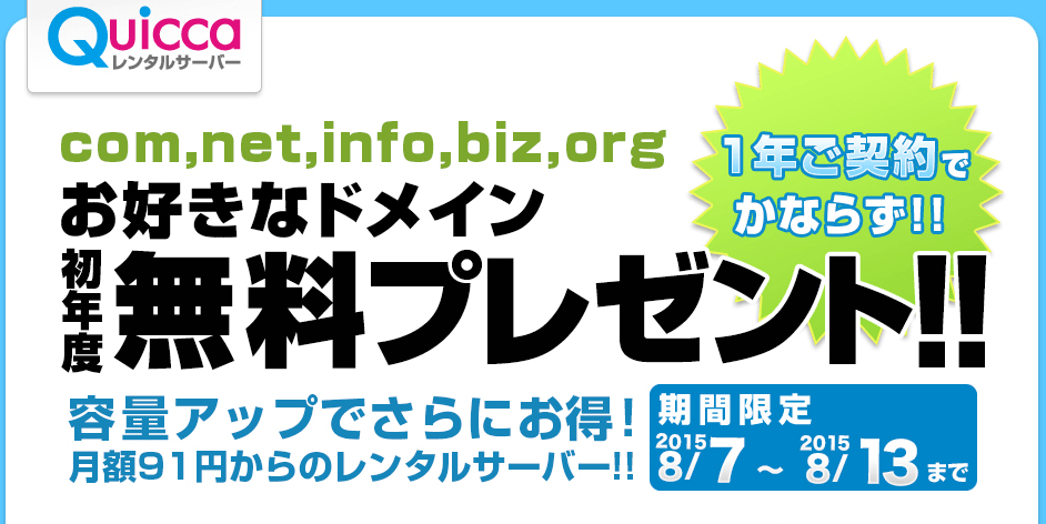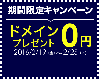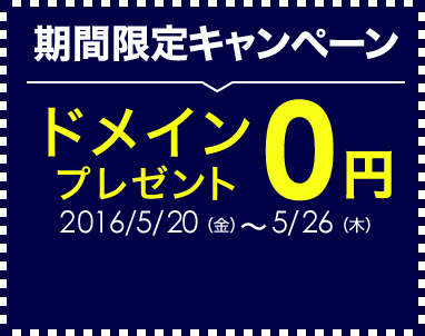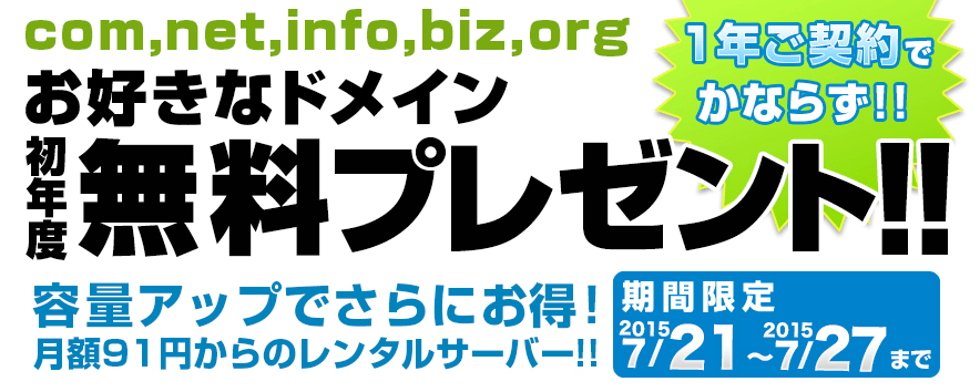 期間中に1年間の新規契約で好きなドメインの取得料金が無料となります。ドメインは、com/net/info/biz/orgから選べます。