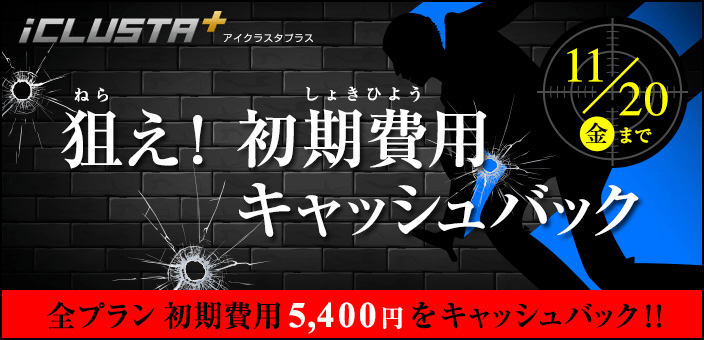期間中に、iCLUSTA+<アイクラスタプラス>を新規に申し込むともれなく初期設定費用5,400円が全額キャッシュバックされます。全プランが対象となります。契約後にキャッシュパック申請フォームでの手続きが必要となります。