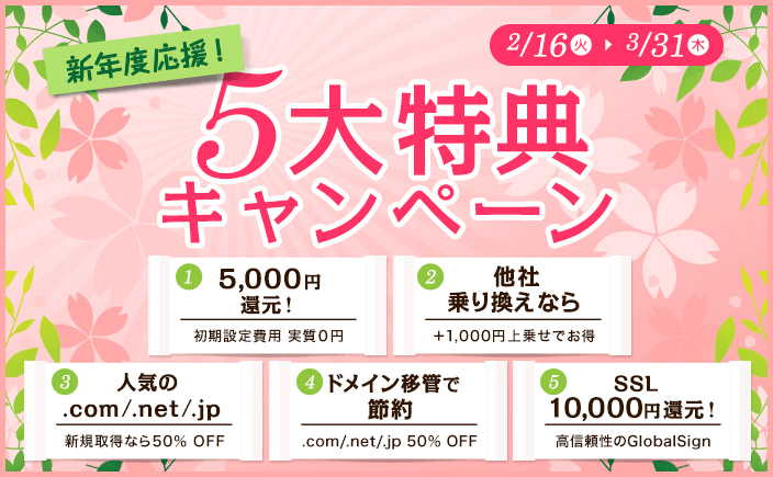 期間中に新規契約すると、初年度のドメイン費用相当額1,800円が初回総支払額から割引となります。契約時にキャンペーンコードを入力することで適用されます。