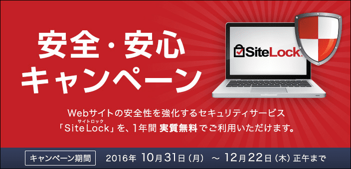 Webサイトの安全性を強化するセキュリティサービス「SiteLock(サイトロック)」を1年間実質無料で利用できるキャンペーンです。契約プランに応じて規定の料金がキャッシュバックされます。SiteLockは、複数のWebセキュリティ診断を定期的に実施し、WordPressやMovable Typeなど主要アプリの脆弱性、不正改ざん、マルウェアの有無などWebサイトに潜む脅威を見つけて、契約者に通知するサービスです。