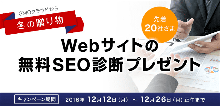 全プランを対象に期間中の契約者から先着20名(要応募)に対して、無料のSEO診断が提供されます。SEO診断を実施するのは株式会社ディテイルクラウドクリエイティブとなります。