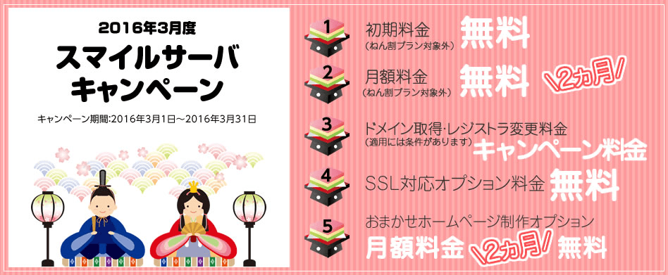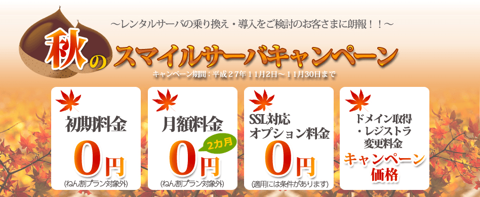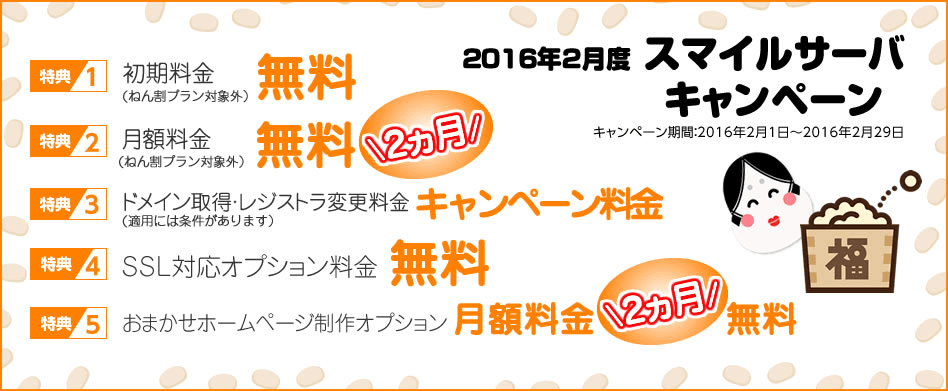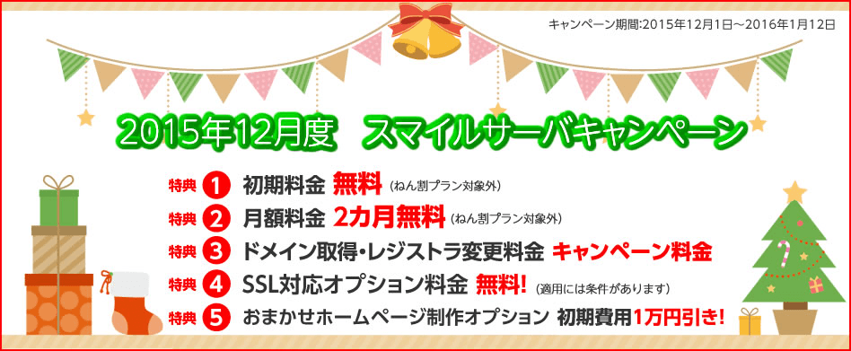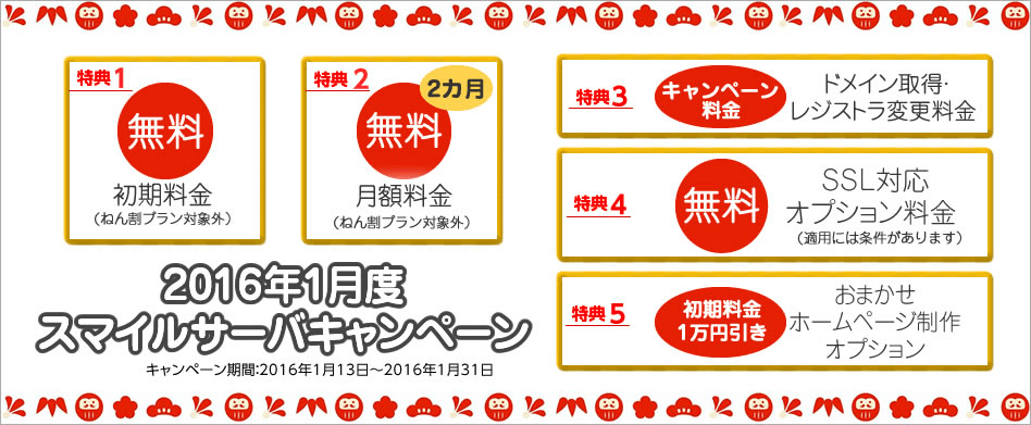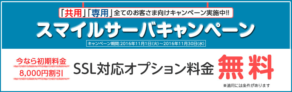 期間中に共用サーバーを新規契約すると、1.初期費用無料、2.月額料金が2ヶ月分無料、となります。「共用サーバWEB&MAIL 100GB ねん割りプラン」は対象外です。