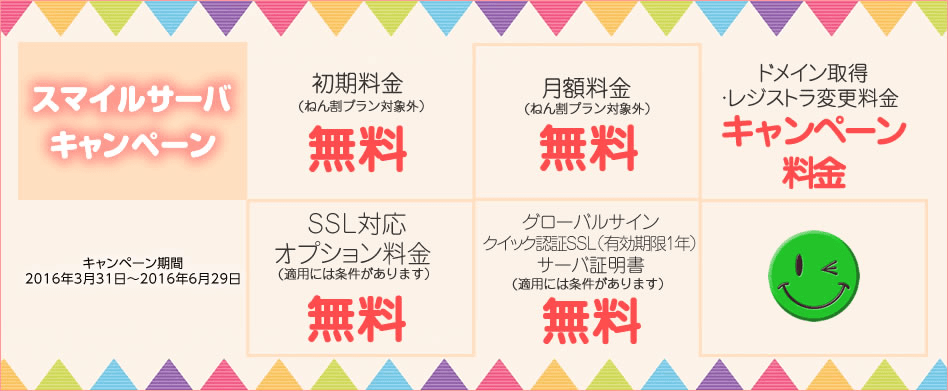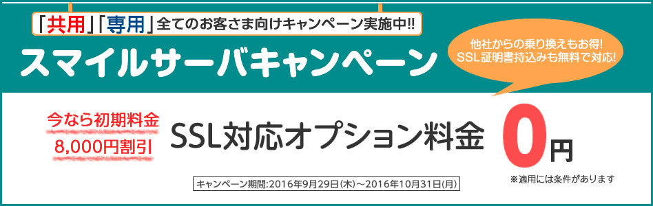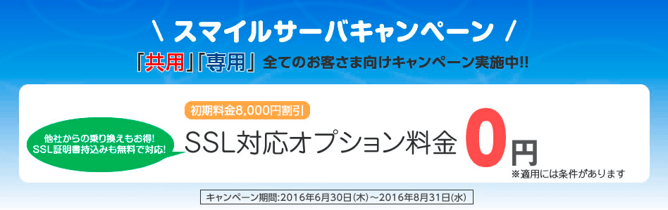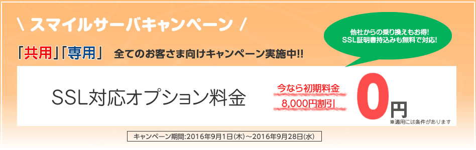 SSL対応オプション(設定費用)の料金が無料(通常8,000円)です。別途SSLサーバ証明書が必要です。