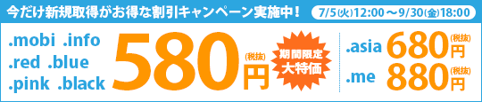 .mobi 580円 / .info 580円 / .red 580円 / .blue 580円 / .pink 580円 / .black 580円 / .asia 680円 / .me880円