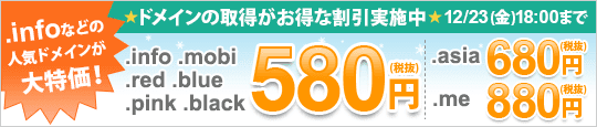 .mobi 580円 / .info 580円 / .red 580円 / .blue 580円 / .pink 580円 / .black 580円 / .asia680円 / .me880円