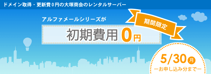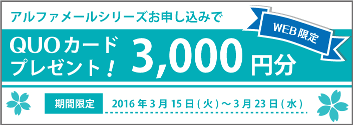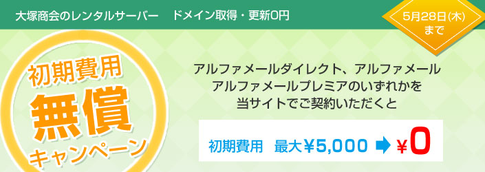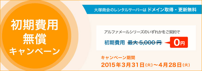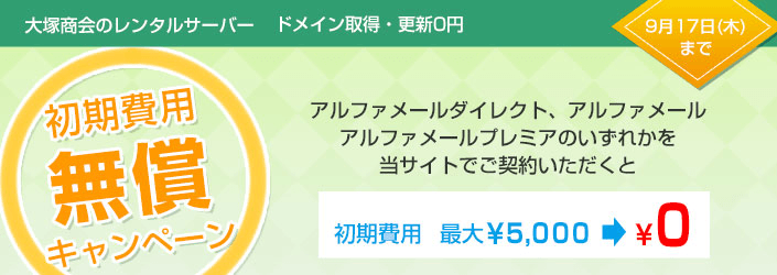 期間中、アルファメールダイレクト、アルファメール、アルファメールプレミアのいずれかを契約すると、初期費用5,000円(最大)が0円となります。