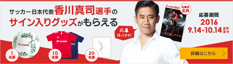 抽選で香川真司選手直筆サイン入りオリジナルグッズが当たるキャンペーン。新規申し込みの方が対象です。サッカーボール(1名)、ユニフォーム(10名)、色紙(20名)。さらに応募者全員にポスターカレンダー(B2サイズ)をプレゼント!