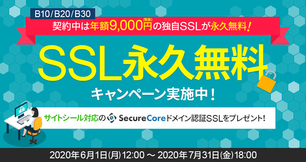 期間中にサーバーを契約すると、通常年額9,000円(税抜)の「SecureCoreドメイン認証SSL」を1つ無料で取得できます。さらに、サーバー契約中は更新料金も永久に無料です。「SecureCoreドメイン認証SSL」はサイトシールに対応しているため、サイトへ訪問するユーザーに安心感を与えることができます。