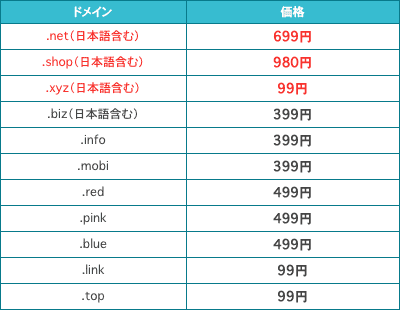.net(日本語含む) 699円 / .shop(日本語含む) 980円 / .xyz(日本語含む) 99円 / .biz(日本語含む) 399円 / .info 399円 / .mobi 399円 / .red 499円 / .pink 499円 / .blue 499円 / .link 99円 / .top 99円