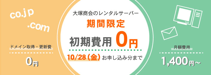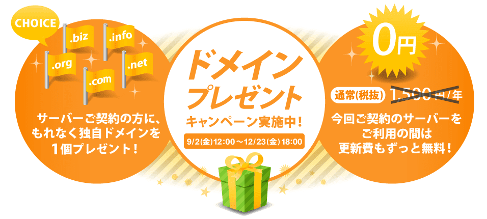 新規にサーバーを契約すると、独自ドメイン(com/net/org/biz/info)1個の取得費と更新費が無料となります。サーバー契約中はず〜っと無料です。全プラン対象です。