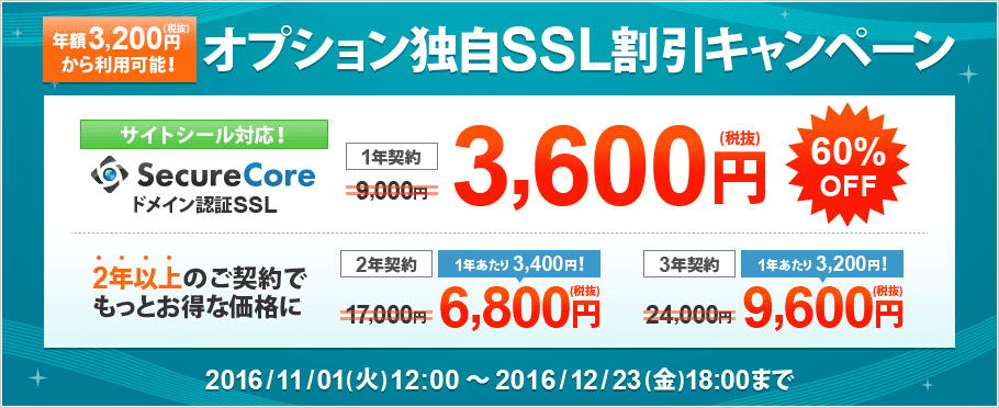 サイトシール対応の「SecureCoreドメイン認証SSL」が、60%オフの年額3,200円(税抜)となる大変お得なキャンペーンです。