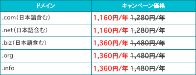 1年契約でドメインを1つ無料で取得できます。「com、net、info、biz、org」から好みのドメインを選択できます。2年目以降は更新費用が必要です。