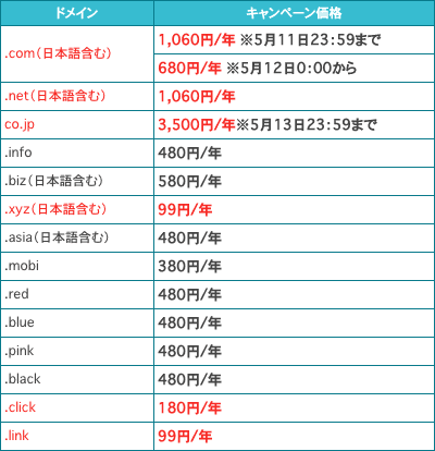 1年契約でドメインを1つ無料で取得できます。「com、net、info、biz、org」から好みのドメインを選択できます。2年目以降は更新費用が必要です。