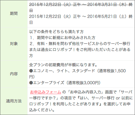 全プランの初期費用が半額になります。下記の条件を満たす必要があります。「1.期間中の新規申込み」 「2.有料・無料を問わず他社サービスからのサーバー移行、または過去にロリポップ!を利用したことがある」。