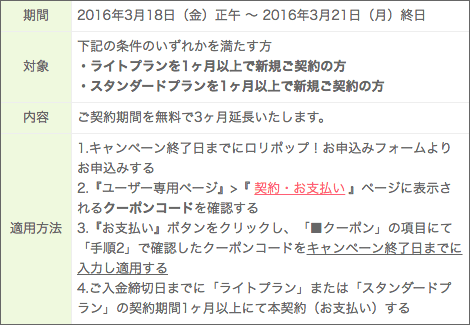 ライトプランまたはスタンダードプランを、新規ご契約の方を対象に、契約期間が3ヶ月分無料延長されます。1ヶ月以上の契約が条件となります。