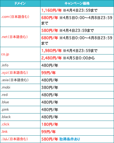 com/1,160円、net/580円、co.jp/1,980円、xyz link/99円、info asia mobi red blue pink black/480円、click/180円、コム/580円