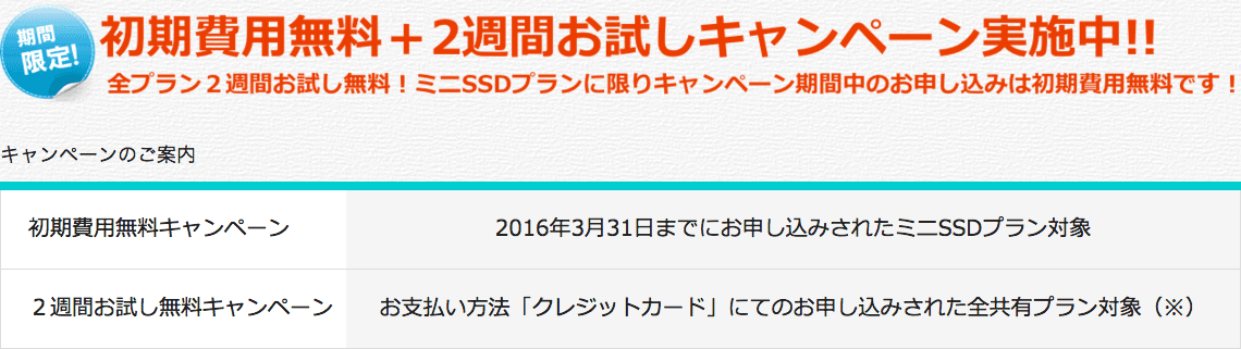 ミニSSDプランの初期費用が無料です。また、全プランを対象に2週間の無料お試し期間が設定されています。