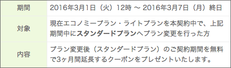 現在エコノミープランまたはライトプランを契約している方を対象に、スタンダードプランへ変更すると契約期間が無料で3ヶ月間延長するクーポンが発行されます。