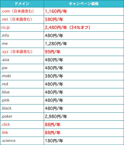 com (日本語含む) 1,160円 / net (日本語含む) 580円 / co.jp 2,480円 / info 480円 / me 1,280円 / xyz (日本語含む) 99円 / asia 480円 / pw 480円 / mobi 380円 / red 480円 / blue 480円 / pink 480円 / black 480円 / poker 2,980円 / click 88円 / link 88円 / science 180円