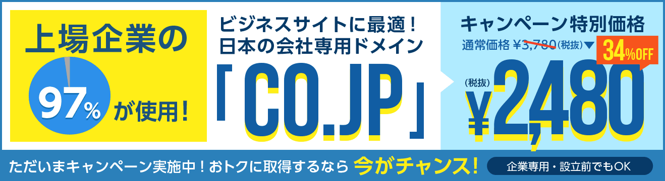 期間中にco.jpを取得すると、SSLサーバー証明書「ラビットSSL」を3年間無料で利用できるクーポンが発行されます。