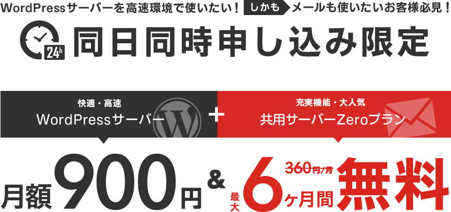 共用サーバーとWordPressサーバーを同時に申し込むと共用サーバーのZeroプラン (月額360円) が最大6ヶ月間無料となります。詳細な条件は公式サイトをご覧ください。