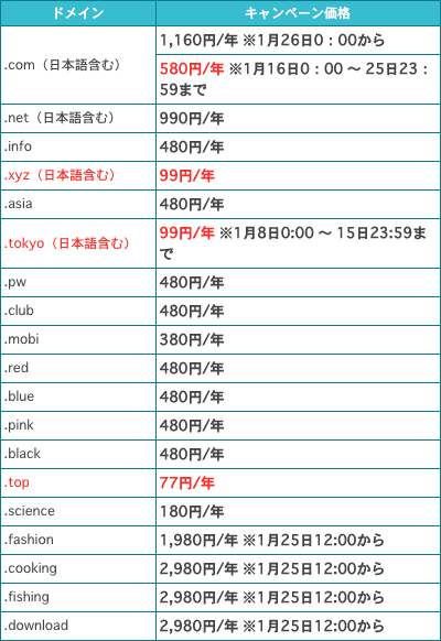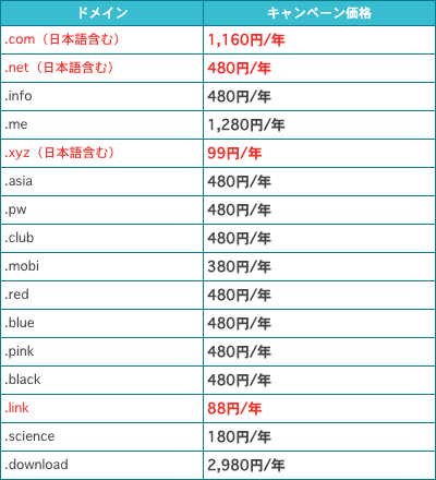 net/infoが480円、xyzが99円、linkが88円、scienceが180円となっています。他にもcom/me/asia/pw/club/mobi/red/blue/pink/black/link/downloadがキャンペーン価格です。
