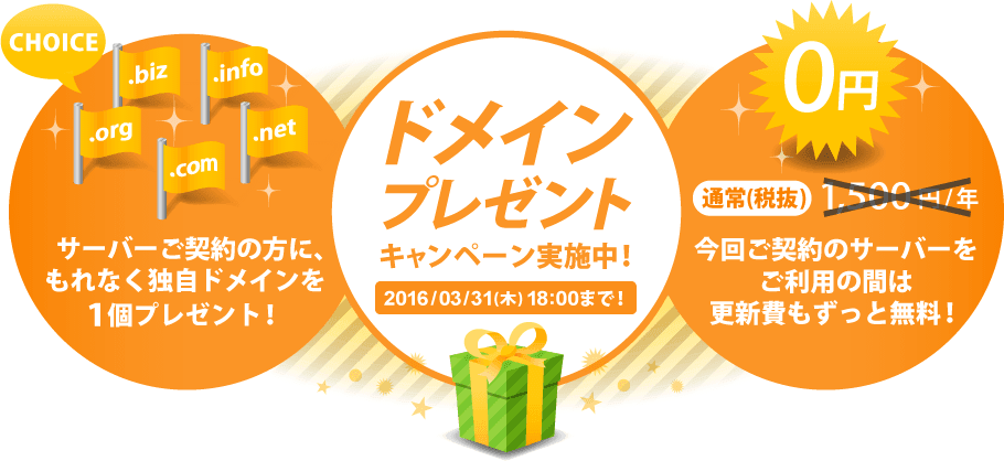 キャンペーン期間中に契約すると独自ドメインを無料で取得できます。契約期間中は更新費用も無料となる非常にお得なキャンペーンです。.com .net .org .info .bizから選べます。全てのプランが対象です。既存のユーザーも対象です。