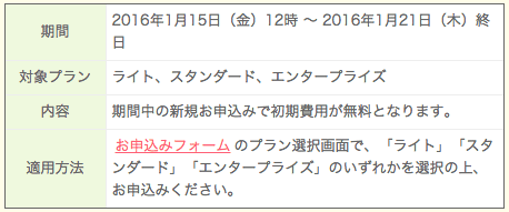全プランの初期費用が半額となります。さらに3ヶ月以上の契約で、利用期間が無料で2ヶ月分延長されます。