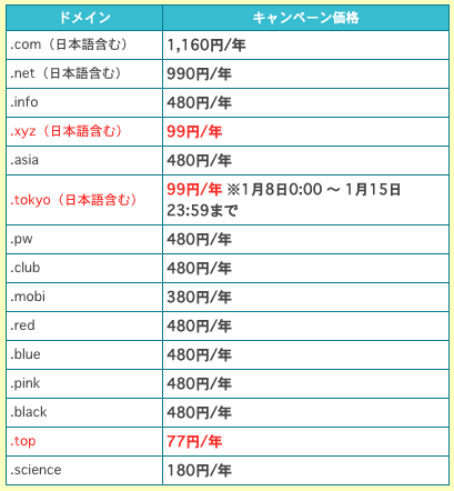 com 1,160円、net 990円、info 480円、xyz 99円、asia 480円、tokyo 99円(〜15日)、pw/club/red/blue/pink/black 480円、mobi 380円 、top 77円、science 180円