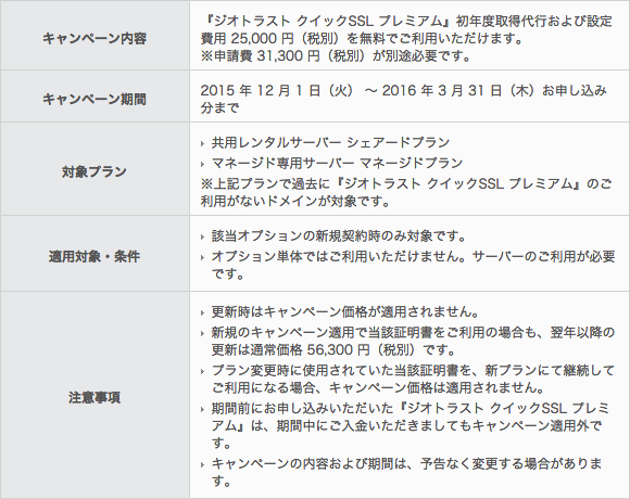 ジオトラスト クイックSSL プレミアム 初年度取得代行および設定費用 25,000 円(税別)が無料となります。