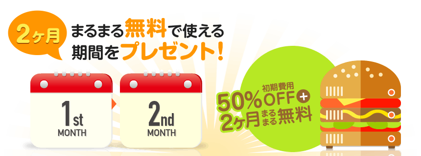 全プランを対象に、初期費用半額、さらに6ヶ月以上の契約で契約期間が無料で2ヶ月延長されます。6ヶ月契約なら8ヶ月間、12ヶ月契約なら14ヶ月間利用できます。