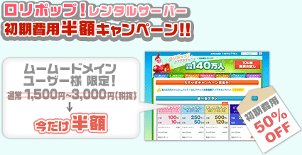 ムームードメインでドメインを管理しているユーザー限定でロリポップ!の初期費用が半額となります。まだドメインを持っていなくても、ドメインの新規契約時にロリポップ!を一緒に契約するとキャンペーン対象となります。全プランが対象です。