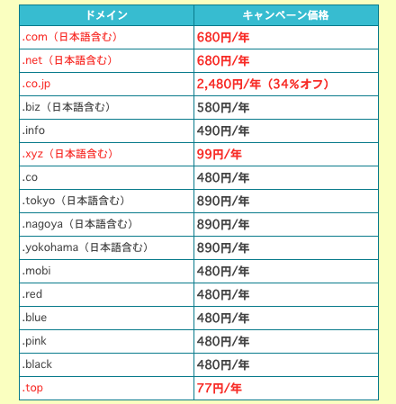 ムームードメインの9月のキャンペーンです。top/77円、xyz/99円、co mobi red blue pink black/480円、info/490円、biz/580円、com、net/680円、tokyo nagoya yokohama/890円、co.jp/2,480円。