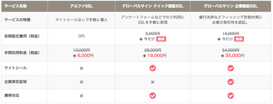 アルファSSL、グローバルサインクイック認証SSL、グローバルサイン企業認証SSLの初期設定費用が無料、年間利用料金が割引価格となります。利用料金は次年度より通常料金となります。