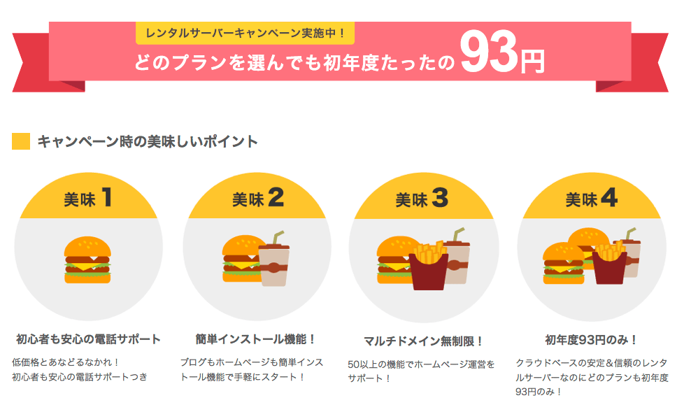 キャンペーン期間中のお申し込みの場合、どのプランでも次回更新時まで総額93円のみでサービスを利用できます。12ヶ月の場合、初年度わずか93円となります。
