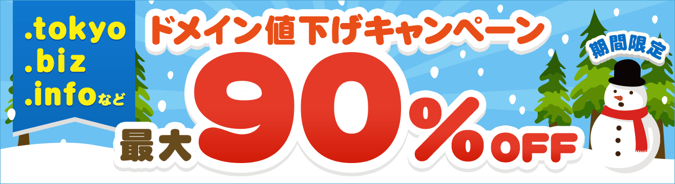 .tokyo 380円/年(59%オフ)。.com(日本語含む)680円/年(26%オフ)※12月12日まで。その他ドメイン、31%〜90%オフ。