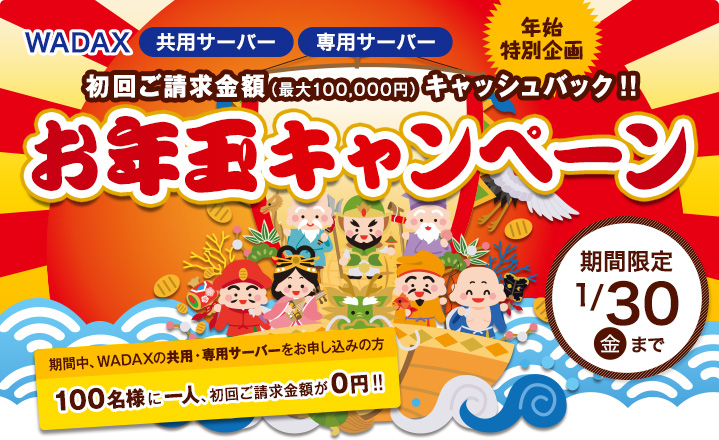 WADAX共用サーバー・専用サーバーをキャンペーン期間中にお申し込みいただいた方で、抽選で100名様に一人、初回請求金額をキャッシュバックさせていただくキャンペーンとなります。