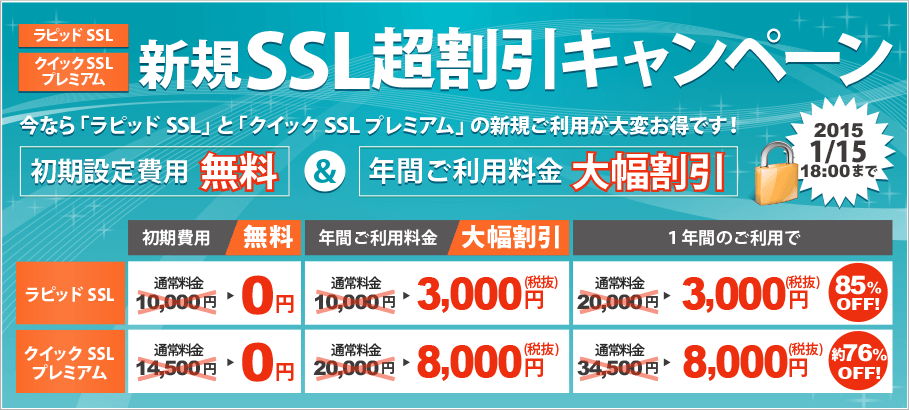 期間中、「ラピッドSSL」、および「クイックSSLプレミアム」の初期費用が無料になると共に、「ラピッドSSL」の年間ご利用料金が3,000円、「クイックSSLプレミアム」の年間ご利用料金が8,000円に!