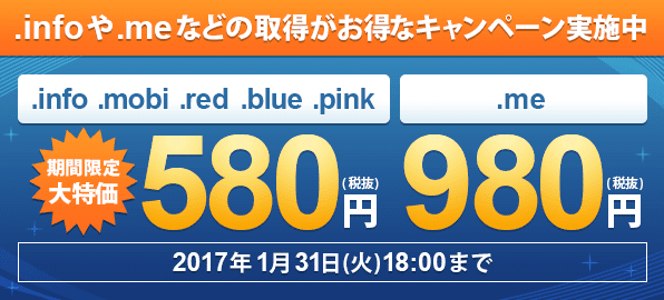 .info 580円 / .mobi 580円 / .red 580円 / .blue 580円 / .pink 580円 / .me 980円