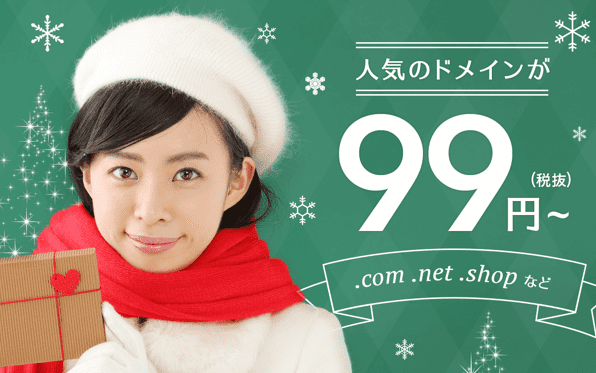 .com(日本語含む) 499円 / .net(日本語含む) 399円 ※12月5日まで (699円 ※12月6日0:00~) / .shop(日本語含む) 920円 / .biz(日本語含む) 499円 ※12月6日0:00~ / .xyz(日本語含む) 99円 /.tokyo(日本語含む) 399円 / .nagoya(日本語含む) 399円 / .yokohama(日本語含む) 399円 / .pw(日本語含む) 399円 / .me 699円 / .info 199円 ※12月2日まで (299円 ※12月3日0:00~) / .red 299円 / .pink 299円 / .blue 299円 / .black 240円 / .click 99円 / .link 99円